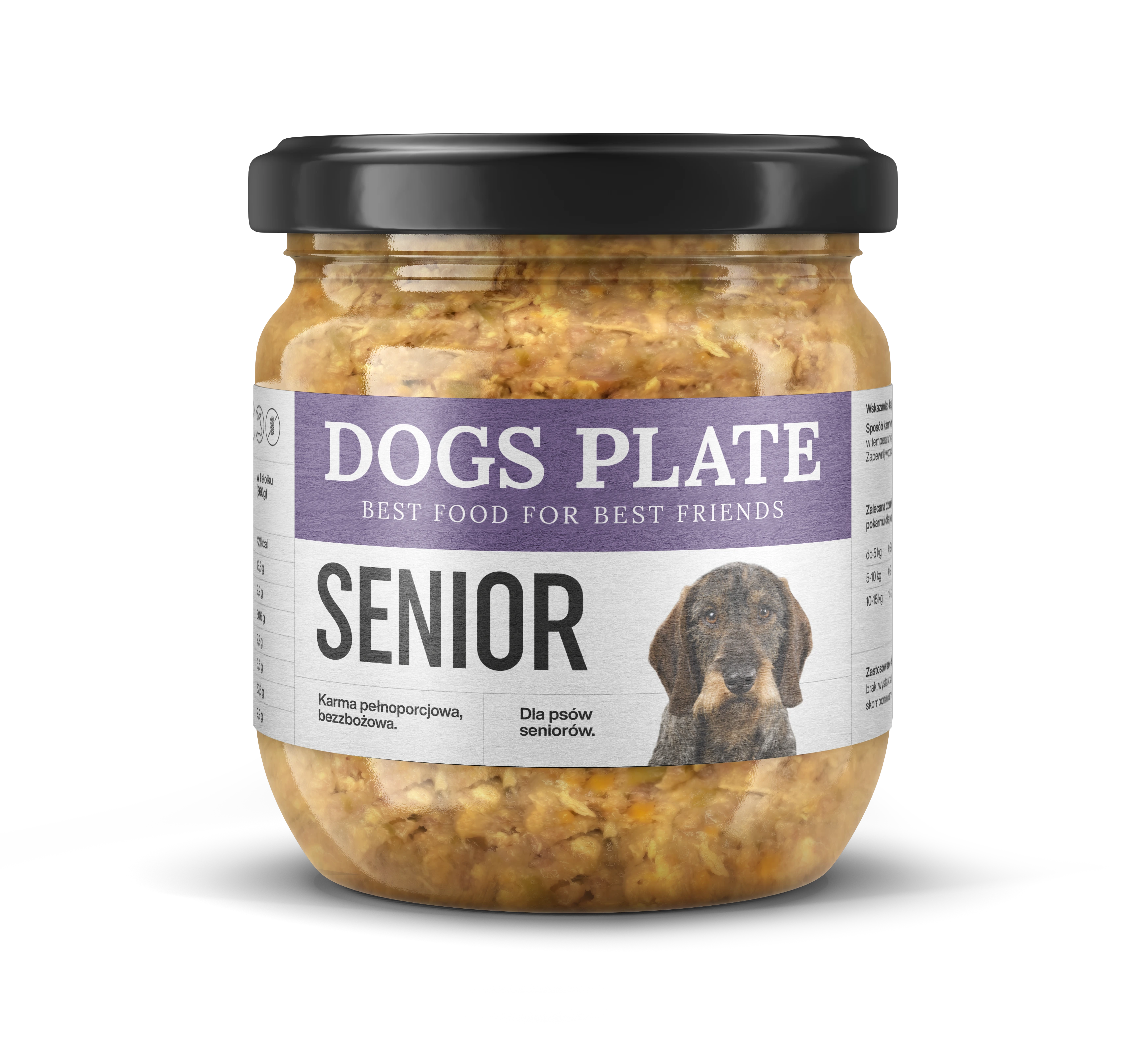 Dogs Plate Senior has been created to help our four-legged friend live long years in excellent health and wellbeing. Protein from poultry and beef supports the proper functioning of organs, muscles and the immune system. The food contains a balanced amount of valuable fats and amino acids, ingredients that aid digestion, as well as a portion of micro- and macroelements which, as you know, strengthen bones, eyesight and important functions of a dog’s nose that naturally weaken with age.