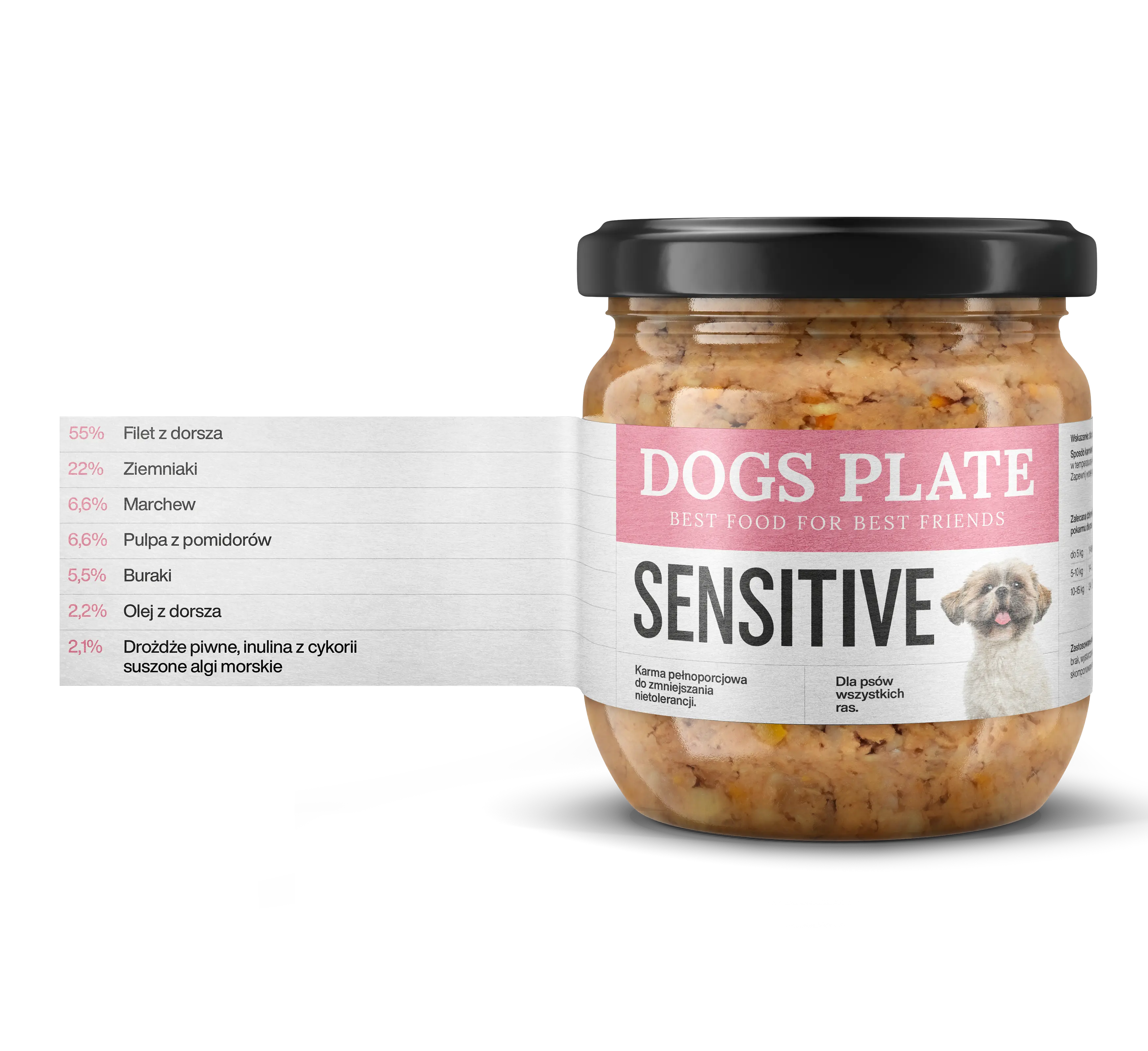 Karma zawiera 55% mięsa z dorsza* – idealna porcja dla psów o delikatnych żołądkach.