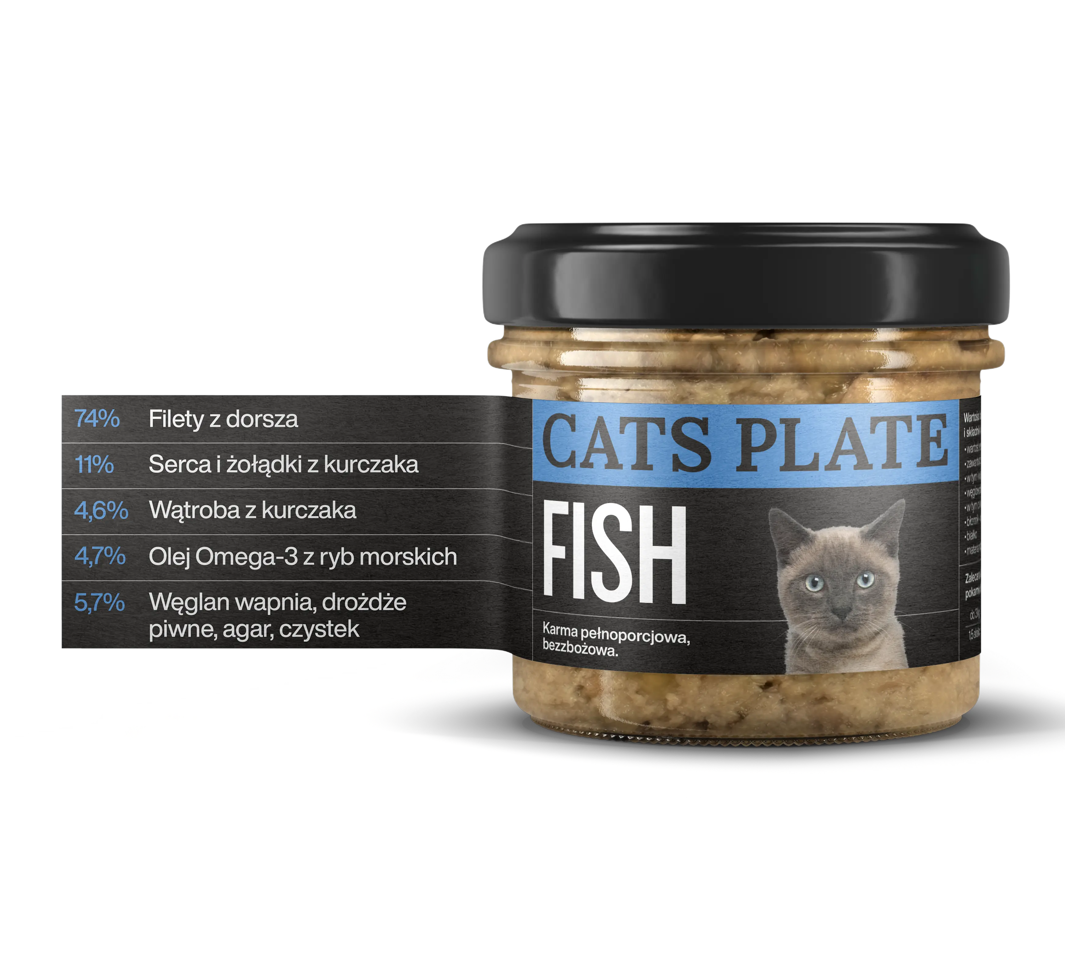 Cats Plate Fish 100g w wersji Outlet to ten sam produkt, który znasz z regularnej sprzedaży — różni się jedynie nieco niższą wagą i wilgotnością. W trakcie gotowania część wody naturalnie odparowała, dlatego zawartość może ważyć do 15% mniej niż standardowo.
