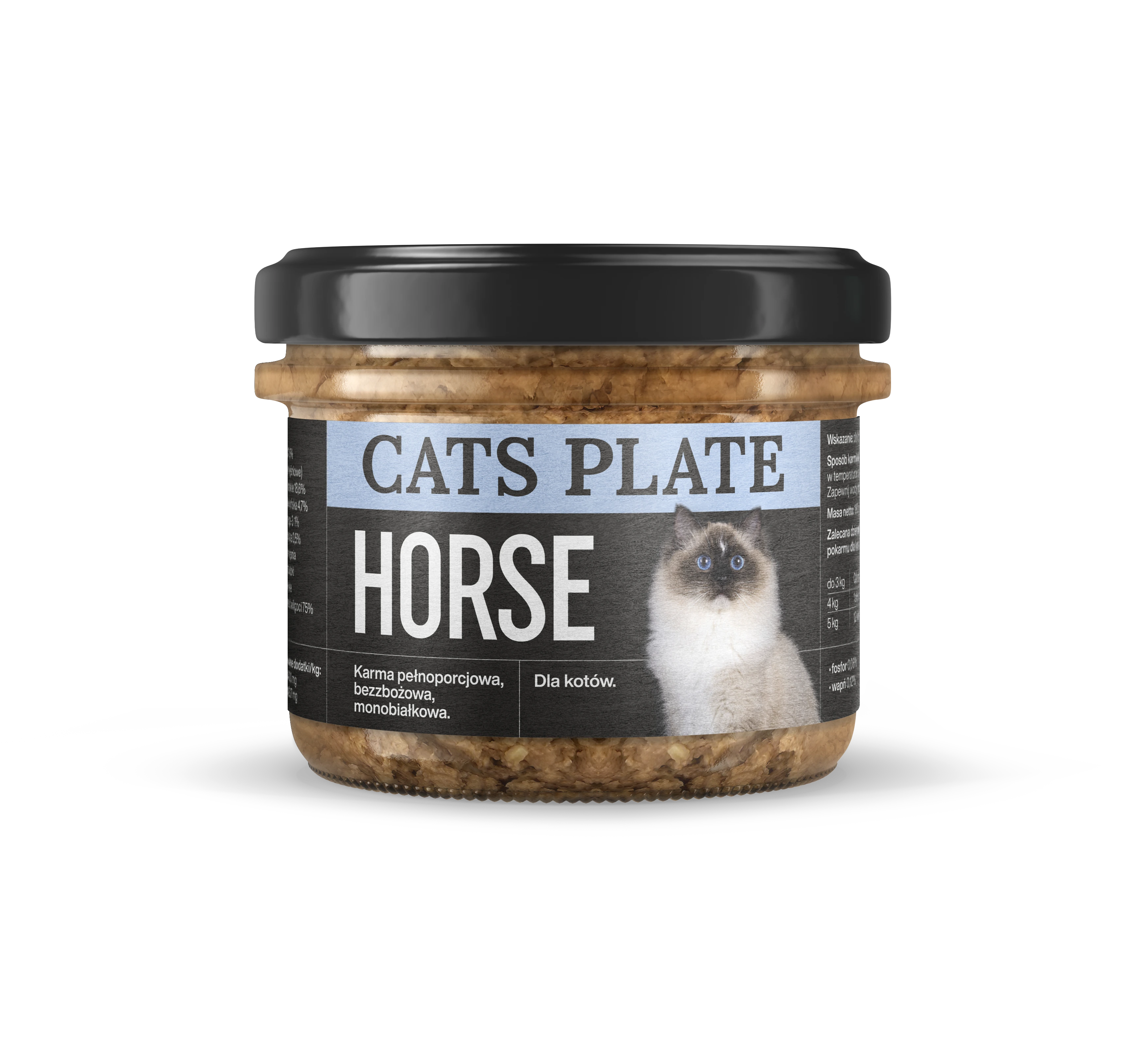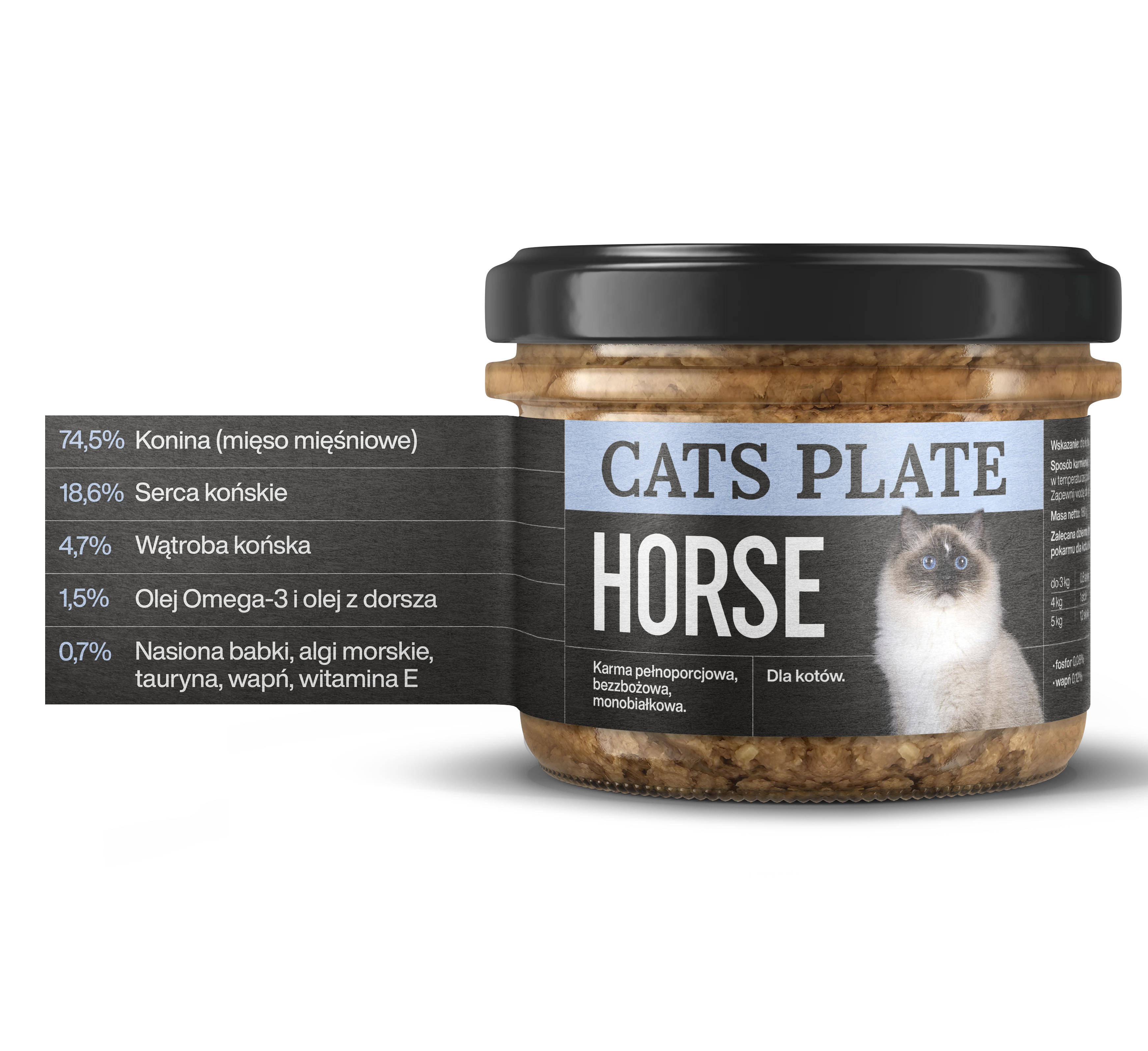 Cats Plate Horse to pełnoporcjowa, monobiałkowa karma dla kotów, które potrzebują naprawdę przemyślanej diety. Jej receptura opiera się wyłącznie na mięsie i podrobach z koniny. Jedno źródło białka oznacza prosty, czytelny skład i dużo większą kontrolę nad tym, co trafia do miski. To szczególnie ważne u kotów z podejrzeniem alergii lub nietolerancji pokarmowych.