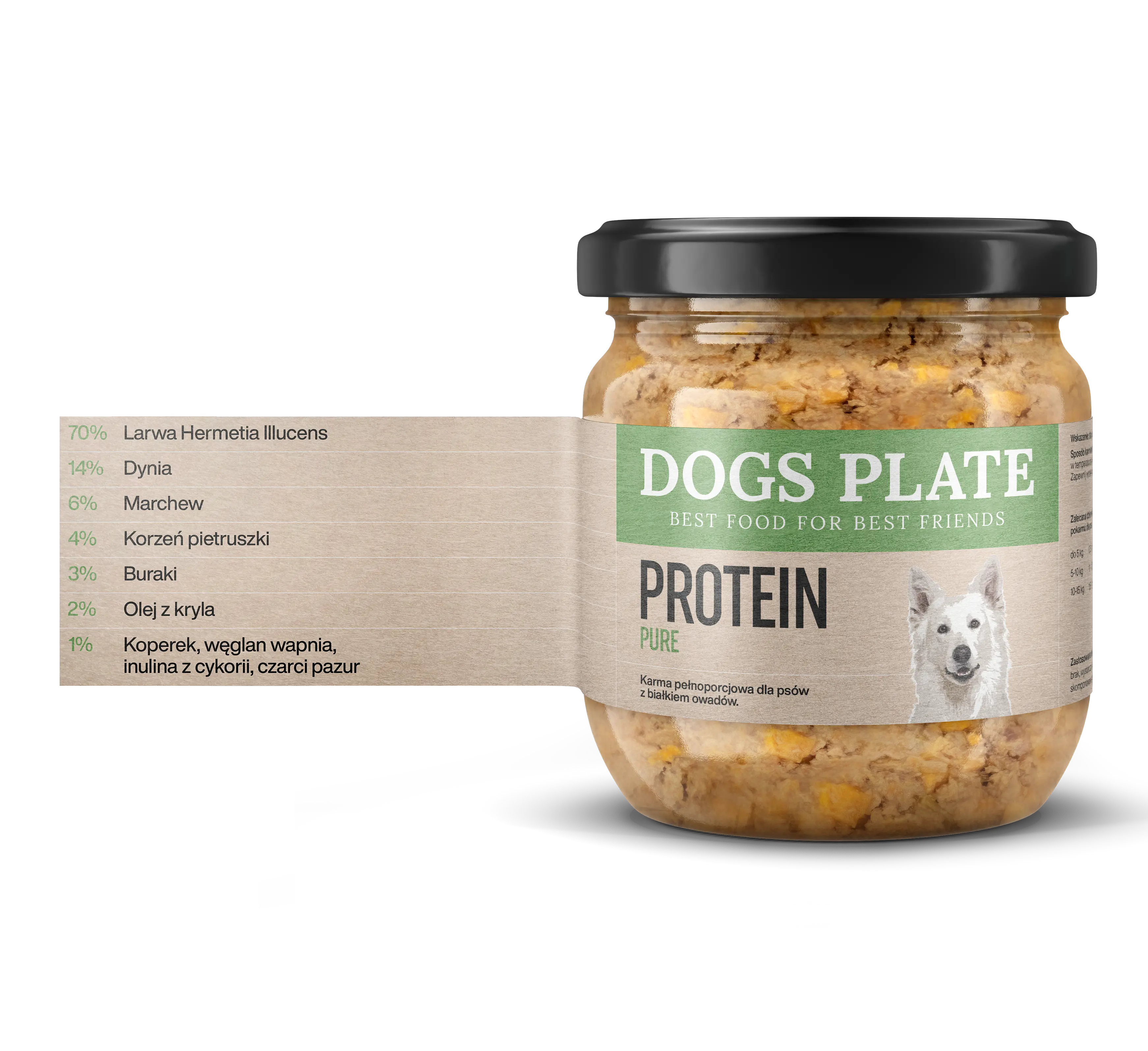 Dogs Plate Protein to karma, która powstała z myślą o ekologicznym i zrównoważonym podejściu do produkcji białka, niezbędnego w psiej diecie. Karma bazująca na paście z larw Hermetia Illucens jest doskonałą propozycją dla wszystkich psów z problemami alergicznymi, wymagającymi diety eliminacyjnej oraz potrzebującymi łatwo przyswajalnego białka.