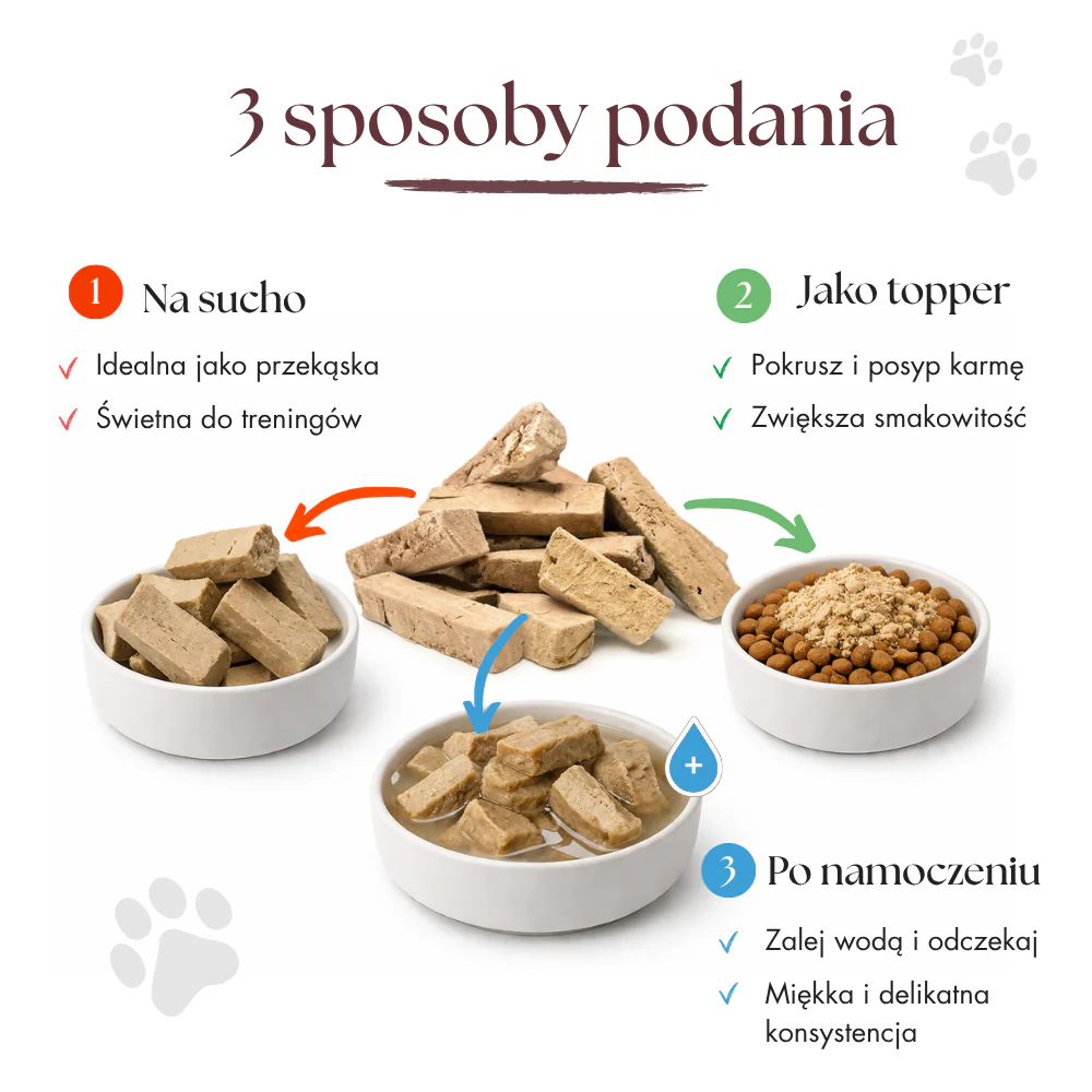 Liofilizowana wątroba jagnięca doskonale sprawdzi się jako nagroda treningowa lub urozmaicenie codziennej diety, szczególnie dla psów z alergiami pokarmowymi. Przysmak można podawać na sucho lub po uprzednim namoczeniu.
