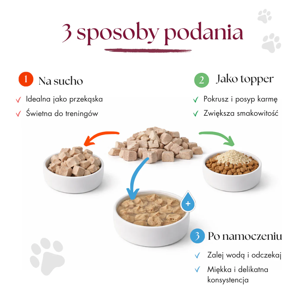Kosteczki mięsne możesz wykorzystać zarówno jako smaczną przekąskę, jak i urozmaicenie codziennego menu pupila. Przed podaniem warto je namoczyć lub rozdrobnić i posypać nimi karmę, by dodatkowo wzbogacić smak posiłku. Pamiętaj, aby Twój kot miał zawsze dostęp do świeżej wody.