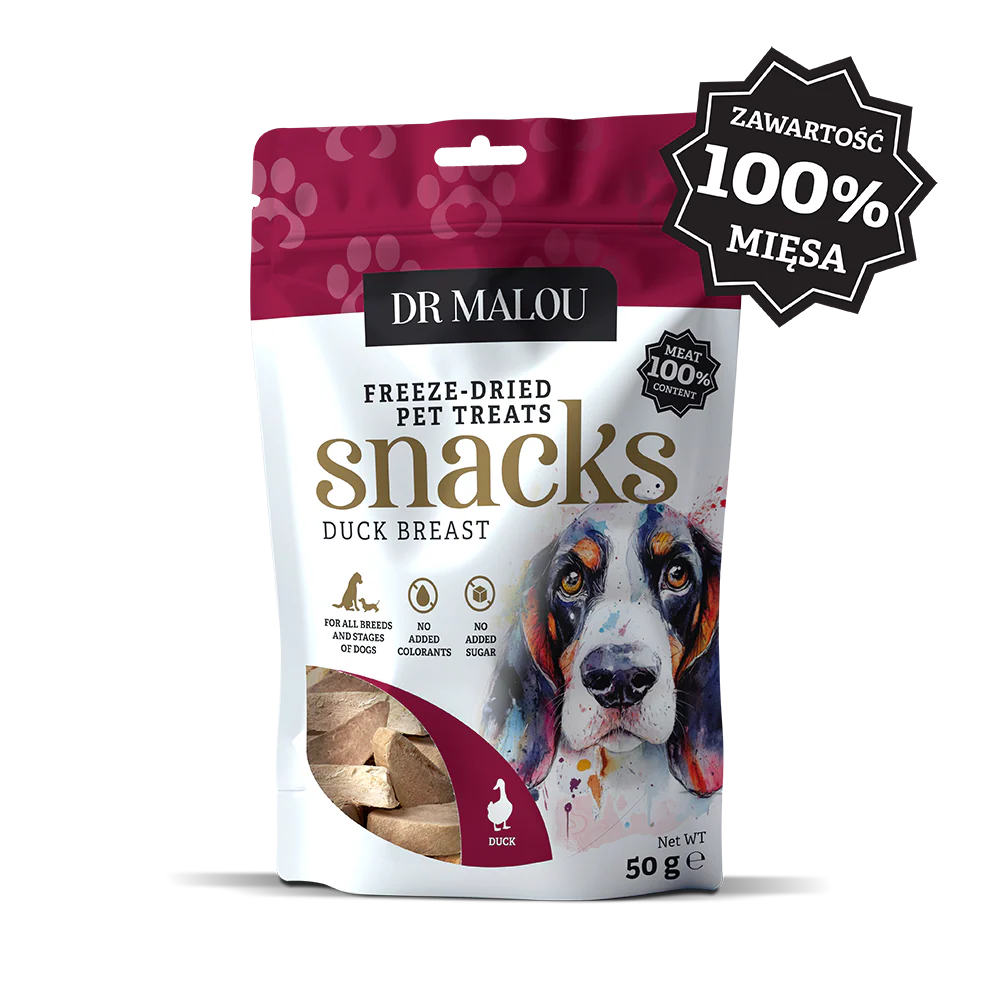 Naturalne przysmaki dla psa – kostki mięsne Dr Malou ze 100% liofilizowanej piersi z kaczki.