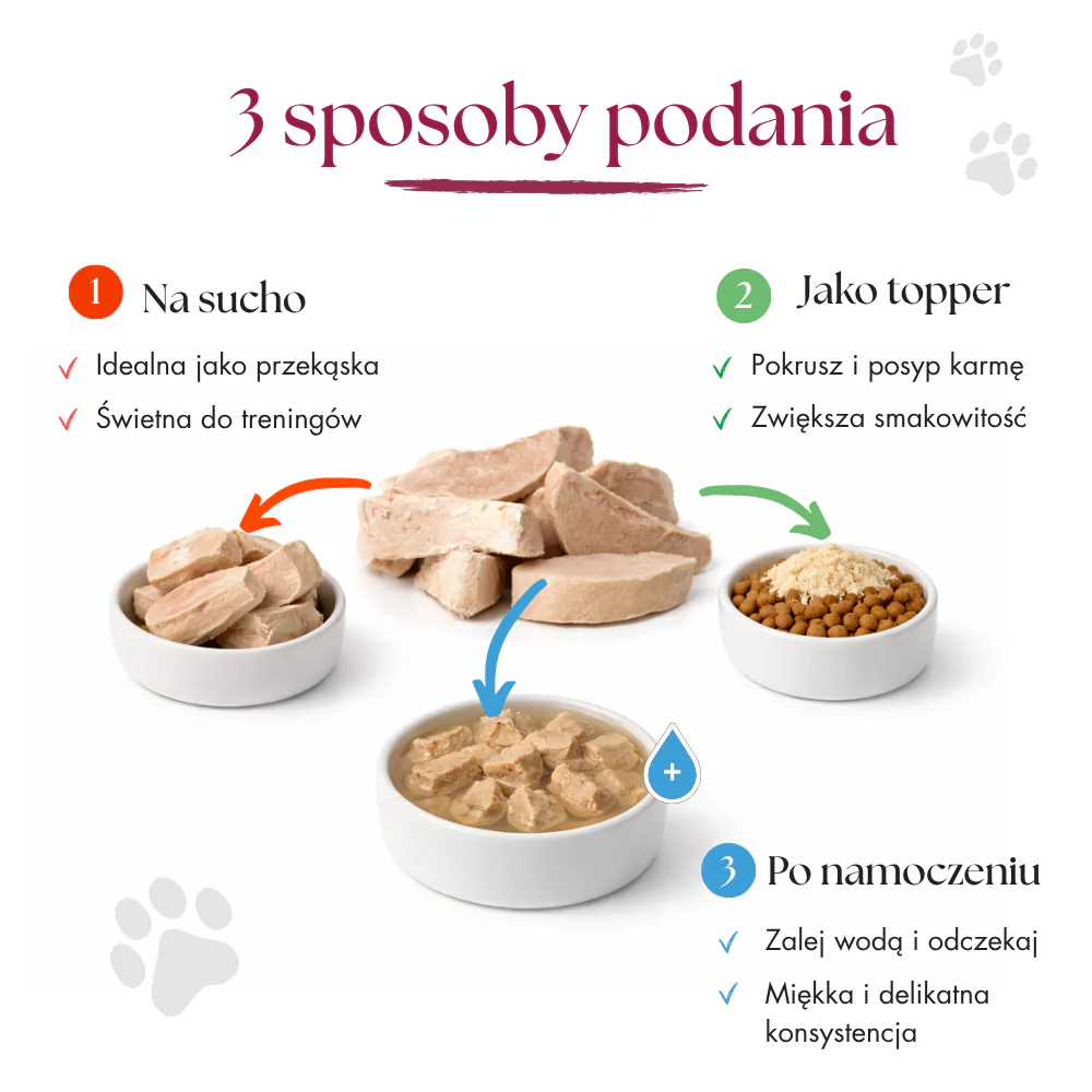 Kosteczki mięsne świetnie sprawdzą się jako smakołyk lub uzupełnienie codziennej diety. Przed podaniem można je namoczyć lub pokruszyć, aby wzbogacić smak posiłku.