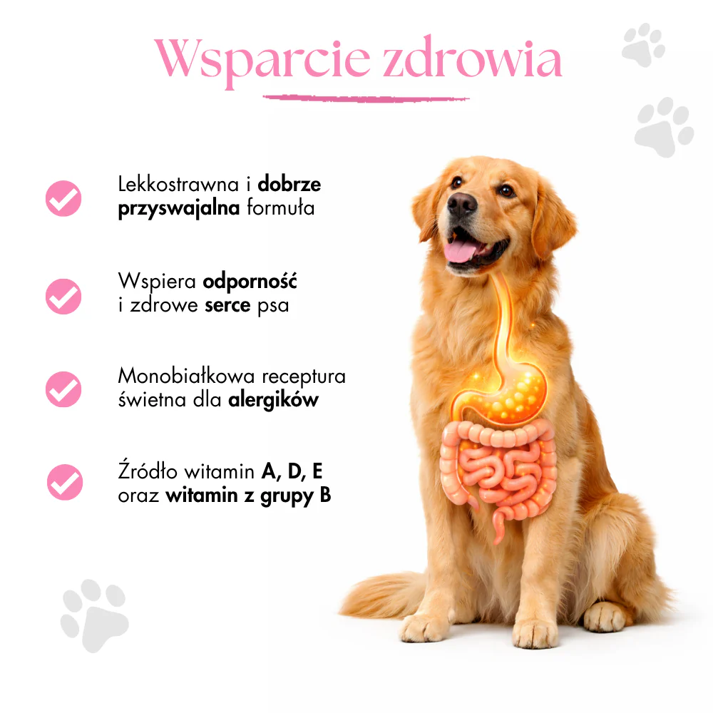 Naturalne przysmaki dla psa dostarczają cennych witamin z grupy B (m.in. B6 i B12), które wspierają układ nerwowy, a także witamin A, D i E – odpowiedzialnych za zdrową skórę, wzrok i odporność.