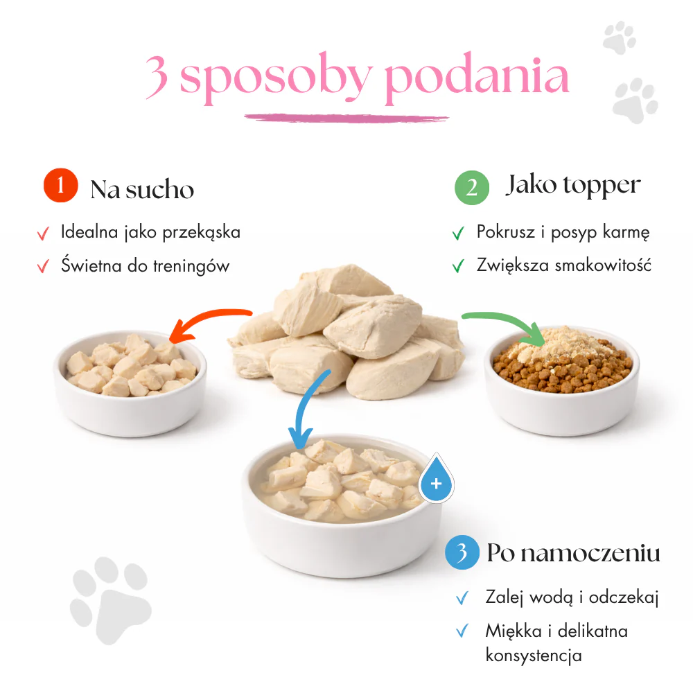 Kosteczki mięsne świetnie sprawdzą się zarówno jako smakołyk, jak i urozmaicenie codziennego posiłku. Można je podawać w całości, namoczyć lub rozdrobnić i posypać nimi karmę, by zwiększyć jej atrakcyjność.