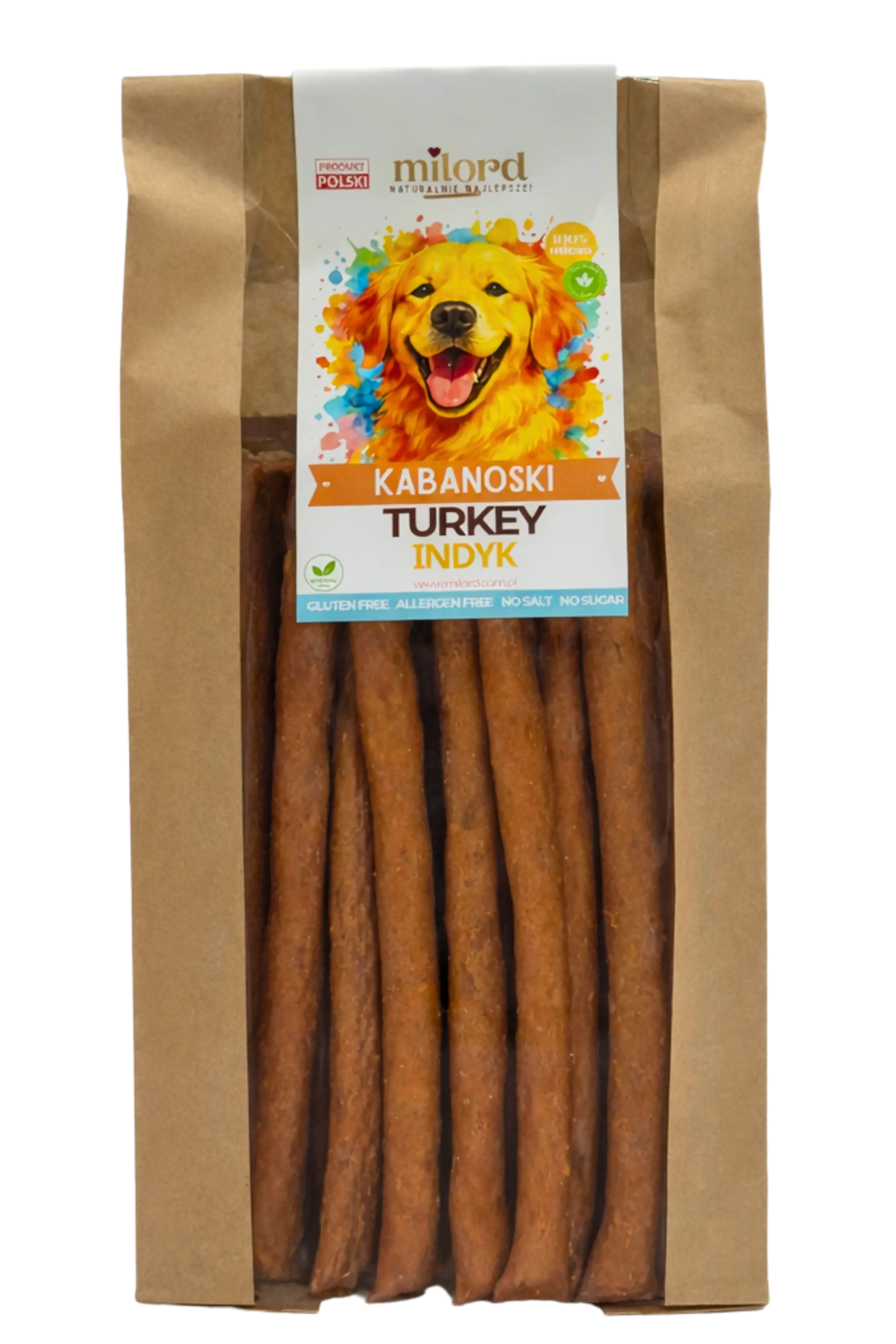 Kabanoski z indyka Milord to delikatny i lekkostrawny przysmak, który sprawdzi się zarówno u psów dorosłych, jak i szczeniąt czy seniorów. Powstają w 100% z mięsa mięśniowego z indyka – bez konserwantów, zbóż i sztucznych dodatków. Dzięki suszeniu ciepłym powietrzem w niskiej temperaturze zachowują naturalne wartości odżywcze oraz wyjątkowy aromat.