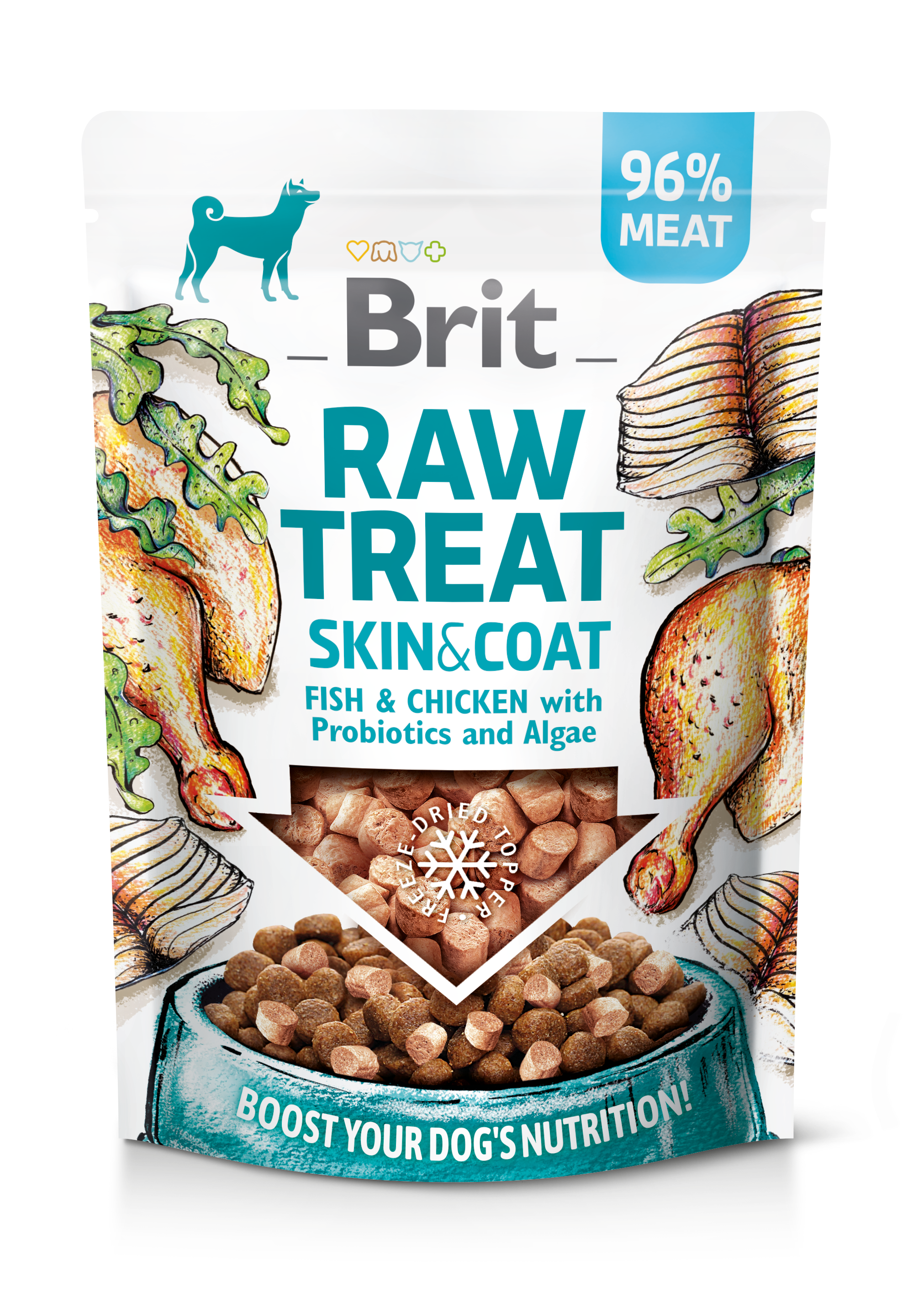 Brit Raw Treat Skin&Coat Fish&Chicken to przysmaki z kurczakiem i ryba wspierające zdrowie skóry i sierści Twojego psa. Skład produktu został wzbogacony o probiotyki o efekcie immunomodulacyjnym, a także algi będące źródłem włókna prebiotycznego.