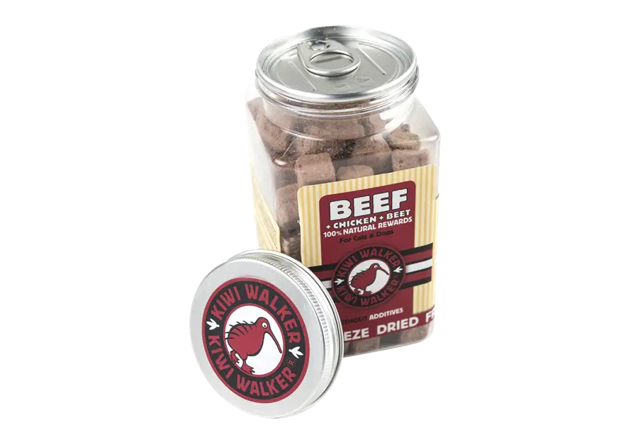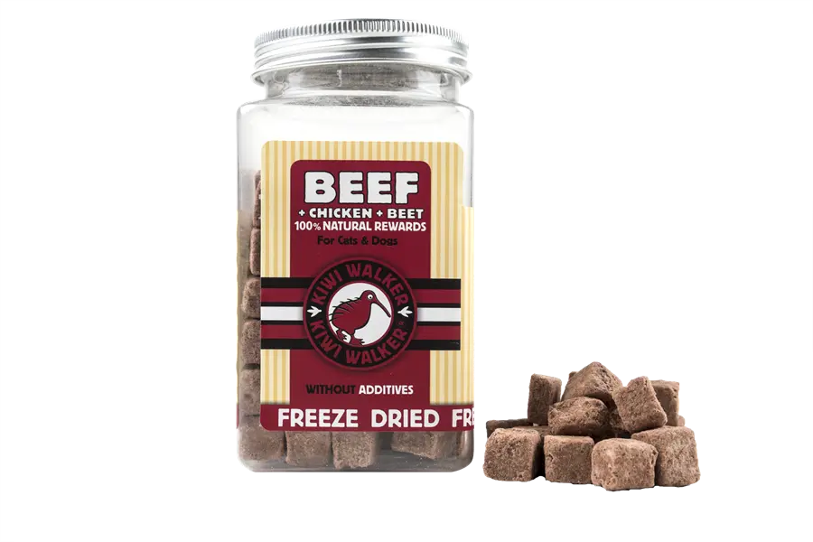 Smaczki Kiwi Walker to prawdziwe mięso wołowe, kurczak i burak, w małych kawałkach, idealne do nagradzania zwierzaka.