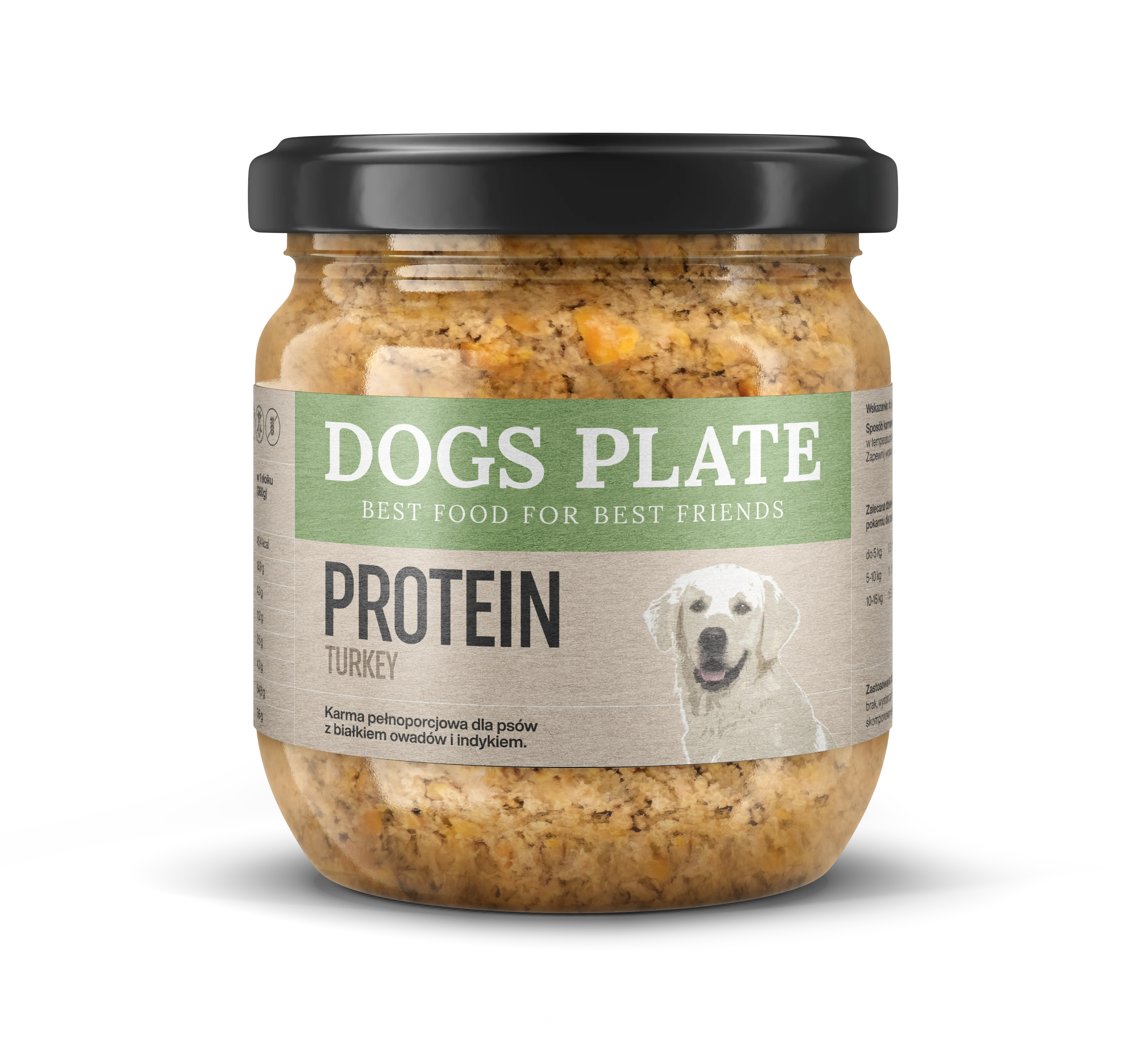 Karma Dogs Plate Protein+ Turkey to karma, która zawiera dwa rodzaje białka - mięso z indyka oraz białko owadzie.